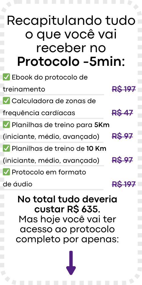 Aprenda todos os detalhes do protocolo de forma prática e acessível, onde e quando quiser. Esse bônus em áudio traz permite que você entenda e aplique as melhores estratégias de corrida em qualquer momento, direto no seu fone de ouvido.
